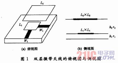 1.3雙層微帶天線的尺寸參數本文采用的基板是TACNIC公司的介質基板,ε1=2.65,h=O.5mm。其中,上貼片L2=95mm,下貼片L1=70mm;底層介質基板的厚度為h1=1mm,中間空氣層的厚度為h2=13mm,介電常數為ε2=1.0(也可以采用介電常數接近于1的泡沫材料代替空氣層,本文選擇用空氣層來達到降低有效介電常數的目的)。