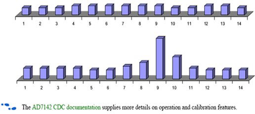 AD7142 CDC并不是設計用作觸摸屏解碼器,而是用于測量電容以及PCB上傳感器線陣的電容變化。AD7142 CDC電氣特性比較完備,能校準特定的PCB布局,然后針對14個傳感器輸入的每一輸入進行電容測量,精度為12位。每個測量周期結束后,通過I2C或者SPI總線來訪問這些數值。AD7142 CDC在SRC信號上發送一個250kHz方波,驅動靠近傳感器板的走線,然后測量接收到的SRC信號強度。由于觸摸屏電容和SRC信號接收強度成正比,因此AD7142 CDC探測并量化用戶手指接觸觸摸屏時的電容變化。