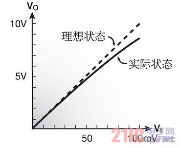通常k>2,故R2>R1。這表明,在電阻器R2中的功耗和溫升總會(huì)超過(guò)在電阻器R1中的功耗和溫升。即使兩個(gè)電阻器均具有相同的TCR(理想情況),該放大器的增益也將變化,這是因?yàn)镽2/R1比率將取決于輸出電壓VO。因而,聲音信號(hào)的典型尖峰和脈沖可能造成放大器增益的瞬態(tài)變化。其結(jié)果是輸入電壓VI和輸出電壓VO之間的非線性依賴(圖4)。這個(gè)現(xiàn)象稱(chēng)作溫度引起的放大器的非線性。其原因是電阻器的自熱,其定量的特點(diǎn)是電阻功率系數(shù)(PCR)。減小電阻功率系數(shù)(PCR)的方法是選擇具有最小絕對(duì)TCR值的R1和R2電阻器。