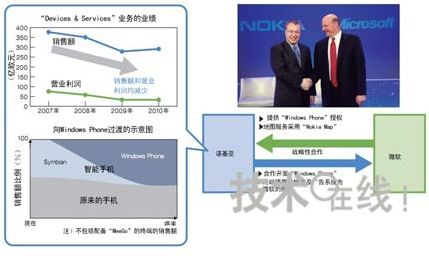 在移動產品的全球最大規模展會“Mobile World Congress 2011”(2011年2月14~17日)開幕前的2月11日,諾基亞宣布了“歷史性”戰略轉換方針。該公司將與美國微軟進行戰略合作,合作內容包括采用“Windows Phone”作為智能手機的主要平臺等(圖1)。