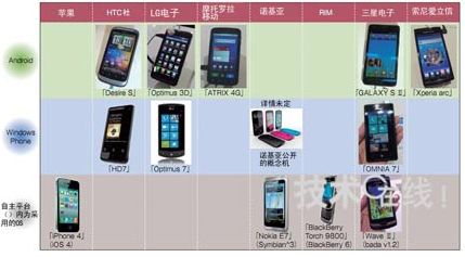 智能手機的平臺集中在Android、Windows Phone以及各廠商自主產品這三個平臺上。本圖以各廠商2011年發布的機型為中心,只標示了具有代表性的產品。采用自主平臺的廠商還自行準備了應用商店等網絡服務。