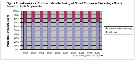 自有品牌智能手機OEM廠商,如蘋果和Research in MotiON (RIM),目前僅利用合同制造商提供EMS服務。RIM和蘋果2010年出貨量與市場份額都取得增長,利益于合同制造商的支持。