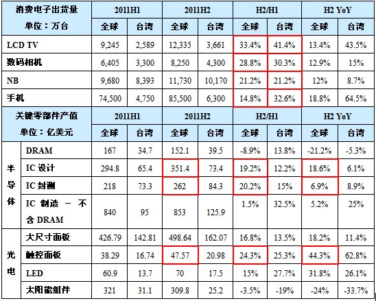 2011上下半年主要消費(fèi)電子及關(guān)鍵零組件成長幅度比較