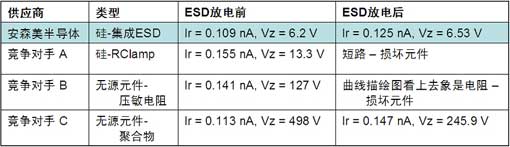 此外,便攜設(shè)備可能遭受多次的ESD電壓應(yīng)力,這在中國北方地區(qū)表現(xiàn)得猶為顯眼。因為,外部保護元件在多種ESD應(yīng)力條件的性能猶為重要,直接決定著便攜產(chǎn)品的可靠性。因此,同樣可以對壓敏電阻、聚合物和硅ESD二極管等保護元件在Tesec直流測試條件下測試,每個元件都施以總計2,000次的15 kV接觸放電ESD脈沖(正向及負向各1,000次),每兩次脈沖的時間間隔為0.1秒。表2所示的測試結(jié)果顯示,安森美半導體的硅集成ESD保護元件在多重應(yīng)力條件下仍然維持極佳的性能,而競爭器件要么損壞,要么性能退化較嚴重。