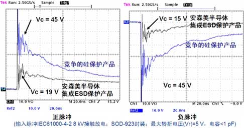 NUP4016和ESD11L5.0D都能在數(shù)納秒時間內(nèi)將15千伏(kV)輸入ESD波形鉗位至不足8伏(V),為當今對ESD敏感的集成電路(IC)提供最高保護水平。這些硅器件沒有無源技術(shù)的磨損問題,在經(jīng)過多次浪涌事件如ESD等后,可靠性和性能都不受影響。