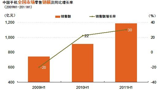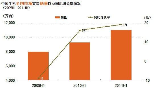 2011年上半年手機(jī)市場(chǎng)繼續(xù)保持較快增長(zhǎng)。據(jù)GfK(捷孚凱中國(guó))全國(guó)零售監(jiān)測(cè)數(shù)據(jù)顯示,2011年上半年銷售量已達(dá)到1.1億臺(tái),同比增長(zhǎng)19%,銷售額達(dá)到1186億元,銷售額同比增長(zhǎng)30%。