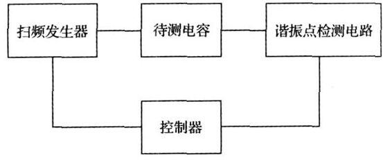 同時諧振發(fā)生時整個LC 回路表現(xiàn)出的阻抗為純阻性, 即感抗和容抗之和為零。利用這個原理, 使用一個掃頻信號激勵待測電容, 測量出諧振頻率, 再結(jié)合式(1) 即可測出寄生電感的大小 。根據(jù)該原理, 設計1 個掃頻發(fā)生器產(chǎn)生掃頻信號激勵待測電容, 然后找出諧振點, 讀出諧振頻率即可求出電容的寄生電感。其結(jié)構(gòu)如圖3 所示。
