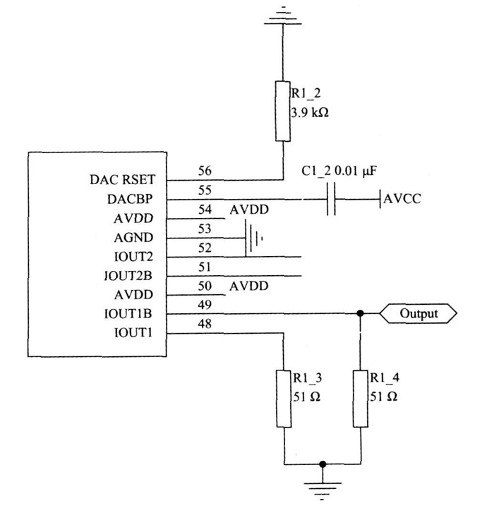 掃頻發(fā)生器在本系統(tǒng)中產(chǎn)生寬頻帶掃頻信號以激勵待測電容, 當電容較大時,以常見的電解電容為例,假設電容為1 000 F, 其寄生電感為100 nH, 則按照式(1)可計算出其自諧振頻率為15. 9 kHz, 諧振頻率較低;另以瓷片電容為例, 假設其電容值為10 pF, 寄生電感約為10 nH, 則其自諧振頻率為500 MHz 這兩個信號頻率相差了4 個數(shù)量級, 這就需要1 個寬帶的信號發(fā)生器, 這也是本部分的設計難點所在。若采用傳統(tǒng)的模擬信號發(fā)生的方法, 為了實現(xiàn)信號頻率的可調(diào), 一般會采用變?nèi)荻O管構(gòu)成的LC 振蕩器, 然而在信號頻率較低時, 所需要的變?nèi)荻O管的電容量會很大,而傳統(tǒng)的變?nèi)荻O管電容值一般只是幾個pF 至幾百pF ,很難滿足低頻振蕩要求。為了簡化掃頻電路, 以及實現(xiàn)數(shù)字化控制, 這里采用DDS 技術(shù)產(chǎn)生寬帶信號。DDS 采用的是DA 轉(zhuǎn)換器的原理, 通過計數(shù)器累加實現(xiàn)的連續(xù)波形輸出 , 而DDS 芯片外圍電路簡單, 通過寫它的寄存器便可實現(xiàn)信號頻率的調(diào)節(jié), 同時產(chǎn)生的信號頻率分辨率高,一般可以達到0. 01 Hz 級別, 信號頻率的跨度大, 可以實現(xiàn)從幾Hz 到幾百MHz 的連續(xù)信號, 非常適合做掃頻發(fā)生器。這里采用了AD9854 這款DDS 芯片, 它在300 MHz 時鐘驅(qū)動下, 按照乃奎斯特采樣定律可以產(chǎn)生最高150 MHz 的信號,為了得到信號較好的頻率則一般只得到最高100 MHz 的信號。若要得到高于100 MHz 的信號, 則可采用其高次諧波得到。基于AD9854 的信號發(fā)生電路如圖4 所示。限于篇幅,僅畫出了關(guān)鍵的輸出部分和電流設置部分。AD9854 內(nèi)置4~ 12 倍頻的時鐘倍頻器, 因此可以外加1 個較低頻率的時鐘,通過倍頻器倍頻至300 MHz, 這樣可以極大的降低高速片外時鐘對系統(tǒng)造成的電磁兼容性問題。AD9854 內(nèi)部有1個頻率控制字寄存器,通過寫該寄存器的值便可以改變輸出信號的頻率, 非常適合數(shù)字控制。同時由于時鐘采用的時晶體振蕩器,因此輸出頻率的穩(wěn)定度和分辨率都非常高, 一般為10- 6數(shù)量級。
