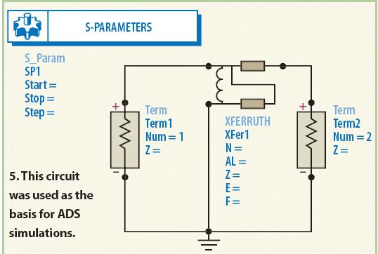 MathWorks的MATLAB數學分析軟件曾被用來分析這種變壓器器件模型的響應。分析中,把單獨的低頻(公式1)響應和高頻(公式5)響應的插損響應結合在了一起。將所需的目標值代入MATLAB公式,可獲得寬帶變壓器的最終響應。為了執行MATLAB模型數值響應的電氣仿真,使用了ADS建模軟件。該軟件有一個很有用的內部源模型,稱為XFERRUTH,其變量參數包括匝數(N)、電感因子(AL)、傳輸線特性阻抗(Z)、傳輸線電氣長度(E),以及計算傳輸線長度所需要的參考頻率(F)。