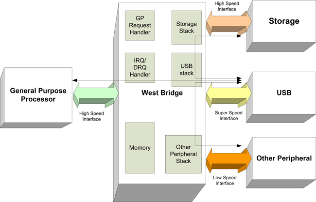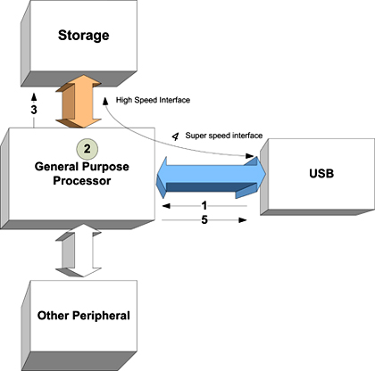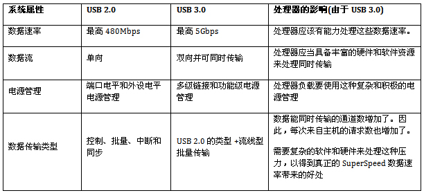 在一個(gè)普通的場景中,在device端,處理器直接連接到USB、存儲器和外設(shè)。記住這種結(jié)構(gòu),由High-Speed過渡到SuperSpeed,處理 器的影響可以概括如下: