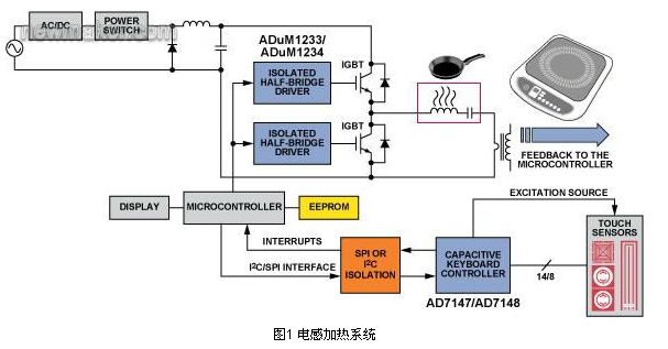 由于在大電流電感電路中可能會產(chǎn)生大電壓,因此在系統(tǒng)中的關鍵位置提供電氣隔離是十分重要的。特別是電磁爐的功率級與微控制器和其它數(shù)字電路隔離。一種隔離方法是使用隔離IGBT驅(qū)動器。與傳統(tǒng)的隔離解決方案相比,基于ADI公司創(chuàng)新的iCoupler®技術的低成本隔離門級驅(qū)動器串聯(lián)電路具有很多優(yōu)點。