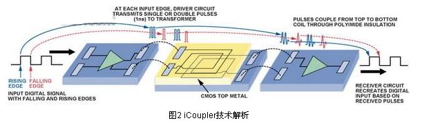 iCoupler技術(圖2)是一種基于變壓器的隔離技術。由于集成了微型變壓器和電子電路,因此它具有光耦合器技術、分立變壓器技術和半導體技術的所有優(yōu)點,而且還消除了光耦合器和分立變壓器的缺點。光耦合器的缺點在于功耗過高,大的定時誤差,數(shù)據(jù)速率限制以及對溫度的敏感性。在基于 iCoupler技術的產(chǎn)品中,通過在變壓器線圈之間使用20 µm厚的聚酰亞胺絕緣層,實現(xiàn)了滿足安全機構標準的絕緣。而且,它還能夠?qū)崿F(xiàn)超過5 kV rms的隔離等級。該技術使用申請專利的刷新電路,在沒有輸入跳變的情況下,通過刷新電路使輸出狀態(tài)輸入狀態(tài)保持匹配,由此消除了分立變壓器的固有缺陷,可以獲得準確的直流電平。