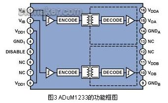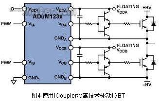 ADI公司的隔離門級驅(qū)動器系列產(chǎn)品采用iCoupler技術,其中雙通道 ADuM1233(圖3)提供了輸出通道和輸入通道之間的隔離以及兩個輸出通道之間的隔離,適用于IGBT控制通道的隔離。