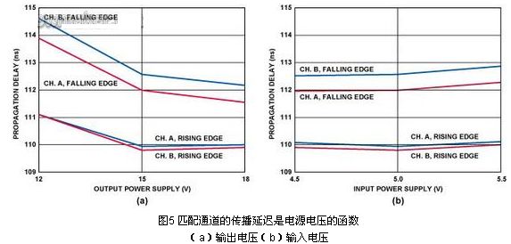 由于兩個通道之間的定時關系是十分重要的,而且PWM信號在反相階段驅(qū)動IGBT,因此與LED和光電二極管相比,iCoupler技術的速度、穩(wěn)定性和可靠性是非常出色的。如圖5的曲線所示,在輸出電壓范圍為12 V~18 V,輸入電源電壓范圍為4.5 V~5.5 V的情況下,兩個通道的上升沿的傳播延遲是匹配的,約為100 ps,而且下降沿的傳播延遲優(yōu)于1 ns。