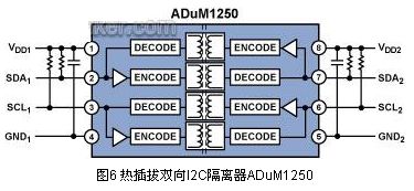 iCoupler技術實現(xiàn)的集成隔離解決方案以較低的成本降低了電路板尺寸要求和設計復雜度。圖6所示的ADuM1250和ADuM1251實現(xiàn)了真正的雙向隔離,并且集成了用于消除毛刺信號和鎖定的緩沖器。這種高度集成的解決方案僅需兩個旁路電容和兩對上拉電阻(I2C標準的規(guī)定),并且能夠以較低的成本提供I2C接口。有關這些器件的使用細節(jié),請參考應用筆記AN-913“PC接口隔離”。