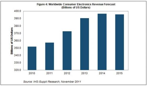 但不都是負面消息。雖然第二和第三季度的消費電子營業收入低于去年同期水平,但隨著電視與藍光播放器假日銷售高于2010年水平,上述趨勢將從第四季度開始逆轉。IHS公司認為,預計2012和2013年增長率將超過4%,相比于當前的低迷狀態,屆時多數消費電子領域將會恢復活力。
