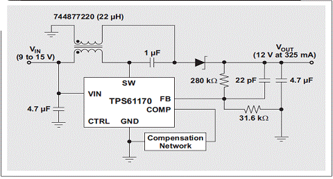 盡管DC/DC單端初級電感轉換器 (SEPIC) 拓撲不是什么新東西,但的確直到最近它才開始流行起來,然而,對于能夠對高低輸入電壓之間的輸出電壓(例如:12V未校準插墻式電源)進行調節的轉換器需求一直都存在。雖然我們可以將任何升壓轉換器/控制器配置為一個 SEPIC,但其在最近才得到普遍的使用。兩個因素促進了 SEPIC 的人氣大增:(1) IC 制造廠商已經開始制造更多具有電流模式控制功能的升壓控制器,旨在簡化補償;(2) 電感制造廠商已經開始制造許多可以最小化轉換器總 PCB 體積的單封裝耦合電感。改用耦合電感以后,許多具有兩個單獨電感應用的電源體積可以縮減三分之一。圖 1 顯示了使用 TI TPS61170 和 Wuerth 744877220 的一個 SEPIC。