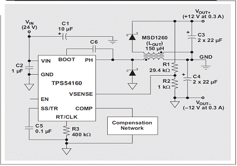 匹配正負電源軌是許多工業應用的常見要求,對放大器而言更是如此。我們可以對寬輸入范圍降壓轉換器進行配置,以提供負輸出電壓。使用一個耦合電感代替這種反相降壓轉換器的電感,并增加一個二極管和電容器,便可將這種反相降壓轉換器變為一個雙輸出的轉換器。圖 3 顯示了以這種方法使用的 TI TPS54160 和 Coilcraft 150-μH MSD1260。只要每個軌的負載稍有接近,我們就對每個軌之間的差異進行調節而非單獨調節每個軌,但耦合電感卻可以幫助提供對每個軌進行調節。