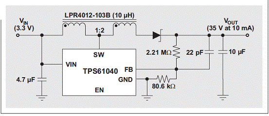 集成 FET 的 DC/DC 轉換器的輸出電壓受限于轉換器的開關電流額定值。將一個 1:1 以上匝比的耦合電感連接至轉換器的開關 (SW) 引腳,可以擴展所有升壓轉換器的有效輸出電壓范圍。例如,圖 4 顯示了 30-V 絕對最大電流額定值的 TI TPS61040 升壓轉換器,其作用是提供 35V 或更高的電壓,同時還顯示了一個 1:2 耦合電感 Coilcraft LPR4012-103B。耦合電感結構多繞組端與二極管串聯時,單繞線電感——以及由此產生的轉換器開關 FET—電壓只有輸出電壓的三分之一,即負輸入電壓。
