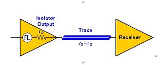 受控阻抗傳輸線是特性阻抗Z0始終受控于其幾何特性的走線。走線長(zhǎng)度大于15mm(tr=1ns)和 30mm(tr=2ns)時(shí),走線阻抗必須要與隔離器輸出阻抗Z0~rO匹配(如圖4所示),使信號(hào)反射最小化。這被稱為源阻抗匹配。