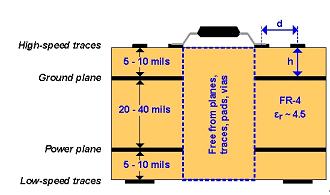 將電源層置于接地層下面。這兩個(gè)參考層構(gòu)成了一個(gè)大約為100pF/in2的附加高頻旁路電容器。