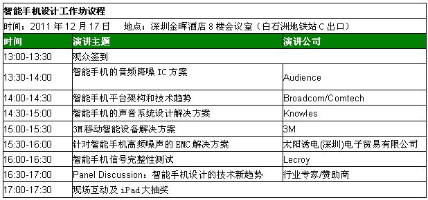 HTC、SAMSUNG、LG、SHARP、AT&T、SK Telecom、PANTECH、DoCoMo 等手機(jī)設(shè)計(jì)領(lǐng)軍廠商在智能市場(chǎng)領(lǐng)域的競(jìng)爭(zhēng)非常激烈,他們都用到哪些技術(shù)?由我愛方案網(wǎng)(www.52solution.com)、電子元件技術(shù)網(wǎng)(www.shuilikongzhifa.com)和China Outlook Consulting主辦的首屆智能手機(jī)設(shè)計(jì)工作坊(Smart Phone Design Workshop)將于2011年12月17日下午在深圳金暉酒店8樓會(huì)議室隆重召開!為您Hold 住 2012 智能趨勢(shì),給力手機(jī)開發(fā)設(shè)計(jì)!