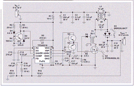 FET 關(guān)閉時(shí),繞組的電壓反向極性,以維持電流。整流器導(dǎo)電向輸出端提供電流時(shí),次級(jí)繞組電壓現(xiàn)在被鉗位至輸出電壓。通過(guò)變壓器作用,它對(duì)初級(jí)繞組的輸出電壓進(jìn)行鉗位。FET 的漏極電壓被鉗位至輸入電壓加輸出電壓。FET“關(guān)閉”時(shí)間期間,兩個(gè)繞組的電流流經(jīng) D1 至輸出端,而初級(jí)電流則流經(jīng) AC 電容。