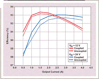 圖 4 顯示了兩種電路的測(cè)量效率。我們可以看到,耦合電感設(shè)計(jì)的效率增加多達(dá) 0.5%。這可能是由于耦合電感設(shè)計(jì)的總鐵芯損耗更低,因?yàn)槠?DC 接線損耗實(shí)際高于使用非耦合電感的設(shè)計(jì)。L2 使用一種粉狀鐵芯材料,其往往具有比L1 和自定義 Renco 耦合電感所用鐵氧體材料更高的損耗。盡管使用了 L2 的鐵氧體材料,但其會(huì)導(dǎo)致更大的面積。