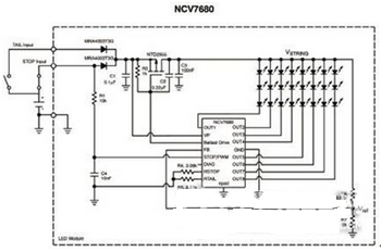 NCV7680集成了眾多功能,支持兩個亮度等級,一級用于停車,另一級用于尾部照明。如果需要,也可使用可選的脈寬調制(PWM)控制。系統設計人員只需使用一個外部電阻設定輸出電流(整體設定點)。另外,針對要求大電流的設計,可選的外部鎮流器場效應晶體管(FET)可以根據設計所需的高電流進行功率分配。延遲的功率極限降低了在過電壓狀態下的驅動電流。這對于沒有外部FET的低電流應用來說十分重要。