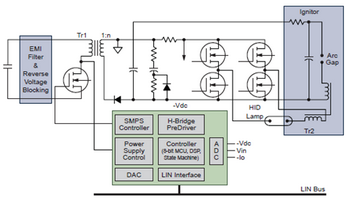 安森美半導體的全功能高強度放電(HID)(或氙燈)專用集成電路有助于改善前燈系統的性能。相對于傳統的鹵素燈,HID改善了顯色性,降低了功耗,使用壽命更長,光輸出更高。為了支持其先進的功能,需要高效率的HID大燈鎮流器和復雜的控制電路。安森美半導體的HID燈控制系統是采用8位微控制器或專用狀態機的混合模擬/數字解決方案,它集成了DC-DC控制器,具備全面的診斷功能(過壓、欠壓、溫度傳感器、續航時間計數器)、各種通信接口(LIN、SPI),支持35 W(D1/D2/D3/D4)和25 W(D5)燈。圖3為該專用集成電路的框圖。
