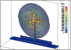本例中使用的螺旋輻射結(jié)構(gòu)非常適于此種工作模式,但是不再需要與帶有吸收體的腔體連接使用。使用這種結(jié)構(gòu)可以創(chuàng)造兩種類型的天線:雙向結(jié)構(gòu),這種結(jié)構(gòu)允許螺旋天線自由地向空間中其平面法線的兩個(gè)方向輻射;或增益更高的單向結(jié)構(gòu),這種結(jié)構(gòu)中反射極緊靠螺旋天線使一個(gè)方向的輻射被反射回來(lái),因此使前向增益增強(qiáng)。圖4給出了一個(gè)雙向螺旋天線。注意到其獨(dú)有特征可以擴(kuò)展頻率覆蓋范圍。圖5給出某同類型天線的電磁仿真。圖6給出類似這種雙向螺旋天線的輻射特性。