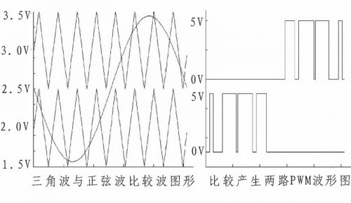 雙路比較器電路采用低功耗、可單電源工作的雙路比較器芯片LM393構成。此處為提高系統效率,減少后級H橋中CMOS管不必要的開合,用兩路偏置不同的三角波分別與音頻信號的上半部和下半部進行比較,產生兩路相互對應的PWM波信號給后級驅動電路進行處理,雙路比較波形圖如圖3所示。此處值得注意的是將上半部比較處理為音頻信號接比較器的負向端、三角波信號接正向端;下半部比較則相反,這樣形成相互對應,在音頻信號的半部形成相應PWM波時,另半部為低電平,可保征后級H橋中的CMOS管沒有不必要的開合,以減少系統功率損耗。利用電位器將上半部比較三角波偏置調至3 V,下半部比較三角波偏置調至2 V.還需注意,三角波信號應比需比較范圍內的音頻信號幅度稍大一些,且偏置調節要較準確,以防音頻信號某些點比較不到,后續濾波還原原信號時產生失真。