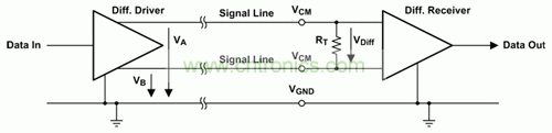 差動信號傳輸采用由兩條導線組成的信號線對:一條用于使電流正向流動,另一條用于使電流回流。每條信號導線都具有一個共模電壓 VCM,該電壓與 50% 的差動驅動器輸出電壓 VOD 相疊加,但彼此極性相反(請參見圖 2)。