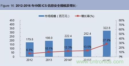 2014藍皮書還指出2013年中國信息安全市場總體規模為194億元,其中工業領域信息安全為23.28億元,占中國信息安全市場的12%。中國工業控制系統(ICS)信息安全市場整體規模為1.98億元,同比增長10.1%,相比2012年增速提高3.3個百分點。