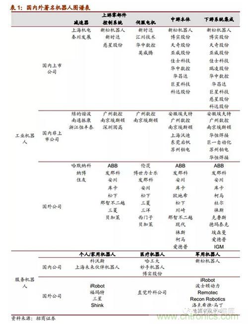 國際服務機器人行業知名企業代表列舉如下:美國iRobot公司、Remotec公司、德國宇航中心、德國機器人技術商業集團、德國KUKARoboterGmbh公司等等。我國服務機器人行業領先科研機構列舉如下:湖北省智能機器人重點實驗室、北航機器人研究所、南開大學機器人與自動化研究所、上海交大機器人研究所和哈工大機器人實驗室等等;服務機器人行業領先企業列舉如下:廣州中鳴數碼科技有限公司、沈陽尤尼克斯機器人有限公司、沈陽新松機器人自動化股份有限公司、盟立自動化科技(上海)有限公司及上海未來伙伴機器人有限公司等。