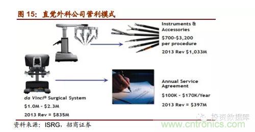 直覺外科公司是全球領先的微創機器人輔助手術機器人公司,2013年營收達22.65億美元,截止2014年第一季度達芬奇機器人累計銷售數量為3039臺,2014年8月總市值達159.60億美元。