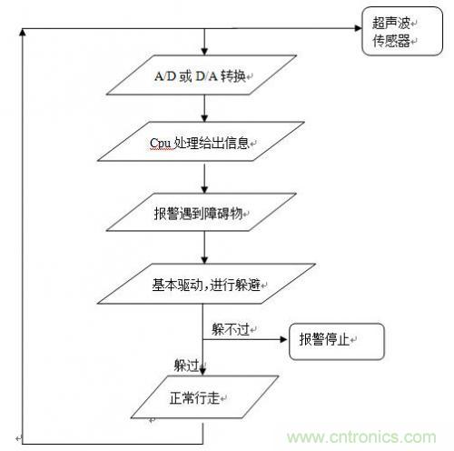 通過CMOS攝像頭采集路況信息,經CPU處理判斷前方是否有障礙物。若無,則車繼續引導人前行;若有障礙物,則車發聲報警。通過超聲波傳感器檢測,如果可以越過則繼續前進,如果無法越過,就停止。如果需要轉彎,則減速轉彎。同時導盲車上還有GPS導航系統,可以確切知道盲人所處位置。