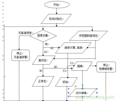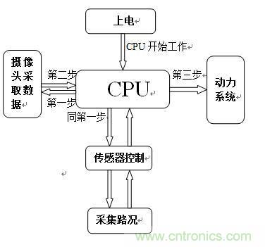 說明:上電之后,CPU開始工作。首先,CPU開始控制攝像頭和傳感器同時工作,同時采集信息,把采集回來的信息進行分析,在CPU內部進行A/D或D/A轉換,然后將轉換后的信息傳遞給舵機,使舵機在CPU的控制下進行工作。