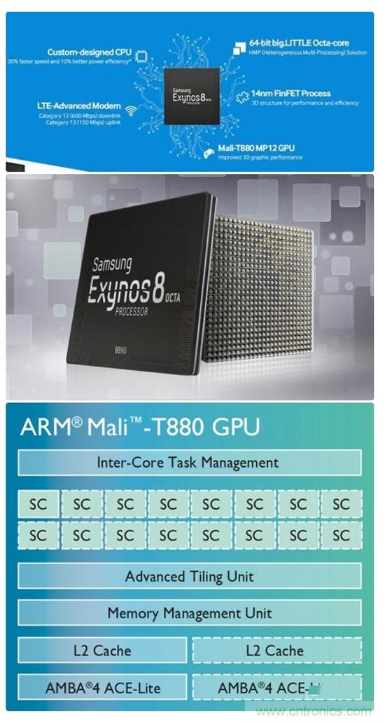 GPU方面是絕對的亮點,和華為麒麟950一樣選擇了Mali-T880,但后綴是“MP12”,開了12個核心(完整16個),性能自然有大幅度提升。相比之下,麒麟950只有4個核心。