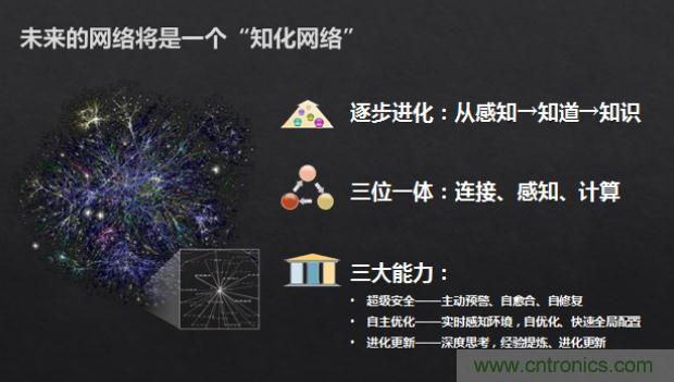 “它”將是一個“知化”網絡,它將逐步進化,從現在這種冰冷的物理連接到主動感知各類連接設備,再到分析了解網絡運行的各種數據,知曉如何適應外界的變化,最后網絡將有智能思考的能力,形成自身的知識,會進行策略選擇和推演,實現人、網絡和應用的融合一體。 未來這個“知化”的網絡將是集連接、感知、計算和數據服務為一體的網絡,將會實現超級安全、自主優化、進化更新等三大能力。