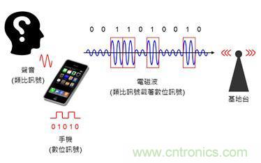 現在的手機是屬于「數字通信」,也就是我們講話的聲音(連續的模擬信號),先由手機轉換成不連續的 0 與 1 兩種數字信號,再經由數字調變轉換成電磁波(模擬信號載著數字信號),最后從天線傳送出去,原理如圖一所示。