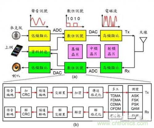 語音上傳(講電話):聲音由麥克風接收以后為低頻模擬信號,經由低頻模擬數字轉換器(ADC)轉換為數字信號,經由「基頻芯片(BB)」進行數據壓縮(Encoding)、加循環式重復檢查碼(CRC)、頻道編碼(Channel coding)、交錯置(Inter-leaving)、加密(Ciphering)、格式化(Formatting),再進行多任務(Multiplexing)、調變(Modulation)等數字信號處理,如圖二(b)所示。