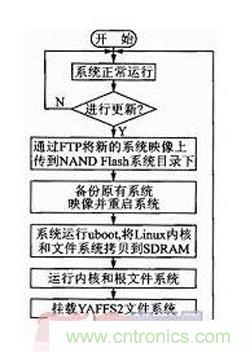 本設計對uboot和Linux內核進行改造,使其支持YAFFS2文件系統,對系統添加ftp、telnet等應用服務。系統更新流程如圖2所示。系統正常運行時管理人員可以通過telnet遠程登錄到嵌入式終端進行監控和管理。當需要對系統進行更新時,通過遠程管理系統的ftp客戶端登錄到嵌入式終端,將需要更新的內核映像和文件系統上傳到NAND Flash。上傳完畢后對原有的內核映像和文件系統進行備份并重啟系統。系統重啟后uboot將NAND Flash中更新后的內核映像和文件系統搬運到SDRAM中,然后跳轉到SDRAM中啟動Linux系統,掛載YAFFS2文件系統,啟動各種應用服務。