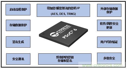 由于許多物聯網系統會處理用戶的個人數據,因此確保數據的安全尤為重要。代碼存儲器也同樣需要保護,以防止設備被非法入侵。外部存儲器在安全性方面更加脆弱,因此需要特殊的機制來保護外部存儲的數據。為此,MCU 使用各種加密技術(例如 AES、DES、RSA)來保護數據和代碼免受非法訪問。例如,賽普拉斯半導體的 PSoC 6 BLE MCU 提供了一個特殊的串行存儲器接口(SMIF)外設,該外設支持直接執行外部代碼的 XIP(現場執行)模式和記錄數據的 MMIO(內存映射 IO)模式。它使用特殊命令進行控制,比如閃存的編程/擦除、存儲器設備的睡眠模式輸入等。