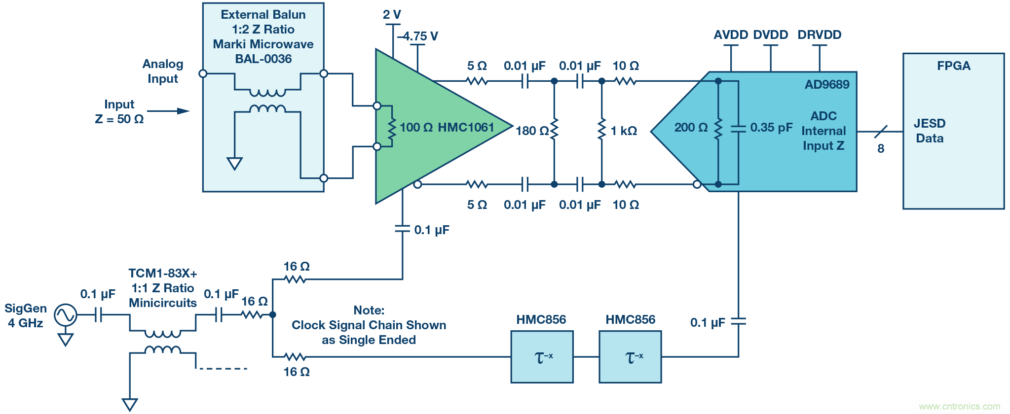以單級THA HMC661為例,產生的輸出由兩段組成。在輸出波形(正差分時鐘電壓)的采樣模式間隔中,器件成為一個單位增益放大器,在輸入帶寬和輸出放大器帶寬的約束下,它將輸入信號復制到輸出級。在正時鐘到負時鐘躍遷時,器件以非常窄的采樣時間孔徑對輸入信號采樣,并且在負時鐘間隔內,將輸出保持在一個相對恒定的代表采樣時刻信號的值。配合ADC進行前端采樣時,常常優先使用單級器件(ADI 同時法布里了兩級THA 的型號HMC1061),原因是多數高速ADC已經在內部集成一個THA,其帶寬通常要小得多。因此,在ADC之前增加一個THA便構成一個復合雙級組件(或一個三級組件,如果使用的是雙級HMC1061),THA在轉換器前面。采用同等技術和設計時,單級器件的線性度和噪聲性能通常優于雙級器件,原因是單級器件的級數更少。所以,單級器件常常是配合高速ADC進行前端采樣的最佳選擇。