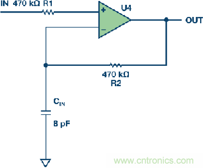 所有運算放大器都有一定的輸入電容,包括差分和共模。如果運算放大器連接為跟隨器,并且在反饋路徑中放入一個電阻以平衡阻抗,那么系統可能容易發生振蕩。原因是:大反饋電阻、運算放大器的輸入電容和PC板上的雜散電容會形成一個RC低通濾波器(LPF)。此濾波器會引起相移,并降低閉環系統的相位裕量。如果降低得太多,運算放大器就會振蕩。一位客戶在一個1 Hz Sallen-Key低通濾波器電路中使用AD8628 CMOS運算放大器。由于轉折頻率較低,電阻和電容相當大(參見圖3)。輸入電阻為470 kΩ,所以客戶在反饋路徑中放入一個470 kΩ電阻。此電阻與8 pF的輸入電容(參見圖4)一起提供一個42 kHz極點。AD8628的增益帶寬積為2 MHz,因此它在42 kHz仍有大量增益,它發生了軌到軌振蕩。把470 kΩ電阻換成0 Ω跳線即解決了問題。因此,反饋路徑中應避免使用大電阻。這里,何者為大取決于運算放大器的增益帶寬。對于高頻運算放大器,例如增益帶寬超過400 MHz的ADA4817-1,1 kΩ反饋電阻就稱得上是大電阻。務必閱讀數據手冊以了解其中的建議。