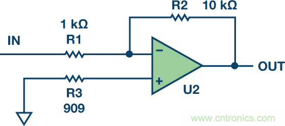 電阻熱噪聲的計算公式為√4kTRB,故1 kΩ電阻會有4 nV/√Hz的噪聲。增加電阻會增加噪聲。在圖2中,出人意料的是,雖然909 Ω補償電阻是值最低的電阻,但由于從該節點到輸出端的噪聲增益,它給圖2輸出端貢獻的噪聲最多。R1引起的輸出噪聲為40 nV/√Hz,R2為12.6 nV/√Hz,R3為42 nV/√Hz。因此,請勿使用電阻。另一方面,如果運算放大器采用雙電源供電,并且一個電源先于另一個電源上電,那么ESD網絡可能發生閂鎖問題。這種情況下,可能希望增加一定的電阻來保護器件。但若使用的話,應在電阻上放置一個旁路電容以減少電阻的噪聲貢獻。