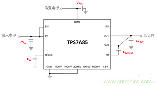 為什么少了四個組件呢?TPS7A85具有TI的可調輸出功能,用戶可以利用電壓設置引腳動態地設置VOUT。只要這些引腳中的其中一個接地,相應的電壓便會加上800mV內部參考電壓。因此,通過將200mV引腳接地,VOUT便立即變為1.0V。