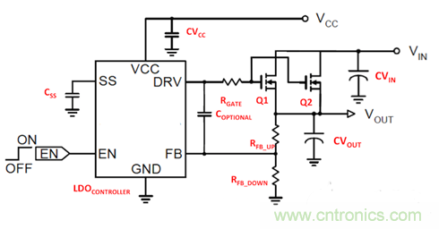【導讀】在亞洲生活和工作讓我遇到了很多有趣的支持問題。例如,最近有人問我TI有沒有針對低壓降控制器的跨設備。該控制器位于小外形晶體管(SOT)-236封裝內,該封裝在印刷電路板(PCB)上所占面積為3mm×3mm。圖1所示為所推薦的控制器原理圖。