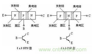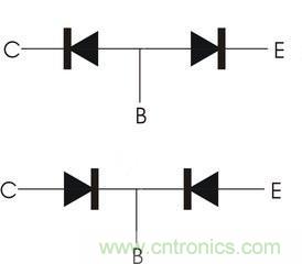 2.發(fā)射結(jié)和集電結(jié)都是屬于pn結(jié),具備pn結(jié)的特性,因此其結(jié)構(gòu)相當(dāng)于一個極(陰極和陰極或者陽極和陽極)并聯(lián)在一起的兩個二極管,這個公共的電極就是基極,而另外兩個極就是集電極和發(fā)射極;見圖二,上面的對應(yīng)的是npn型三極管,下面的對應(yīng)的是pnp型三極管;